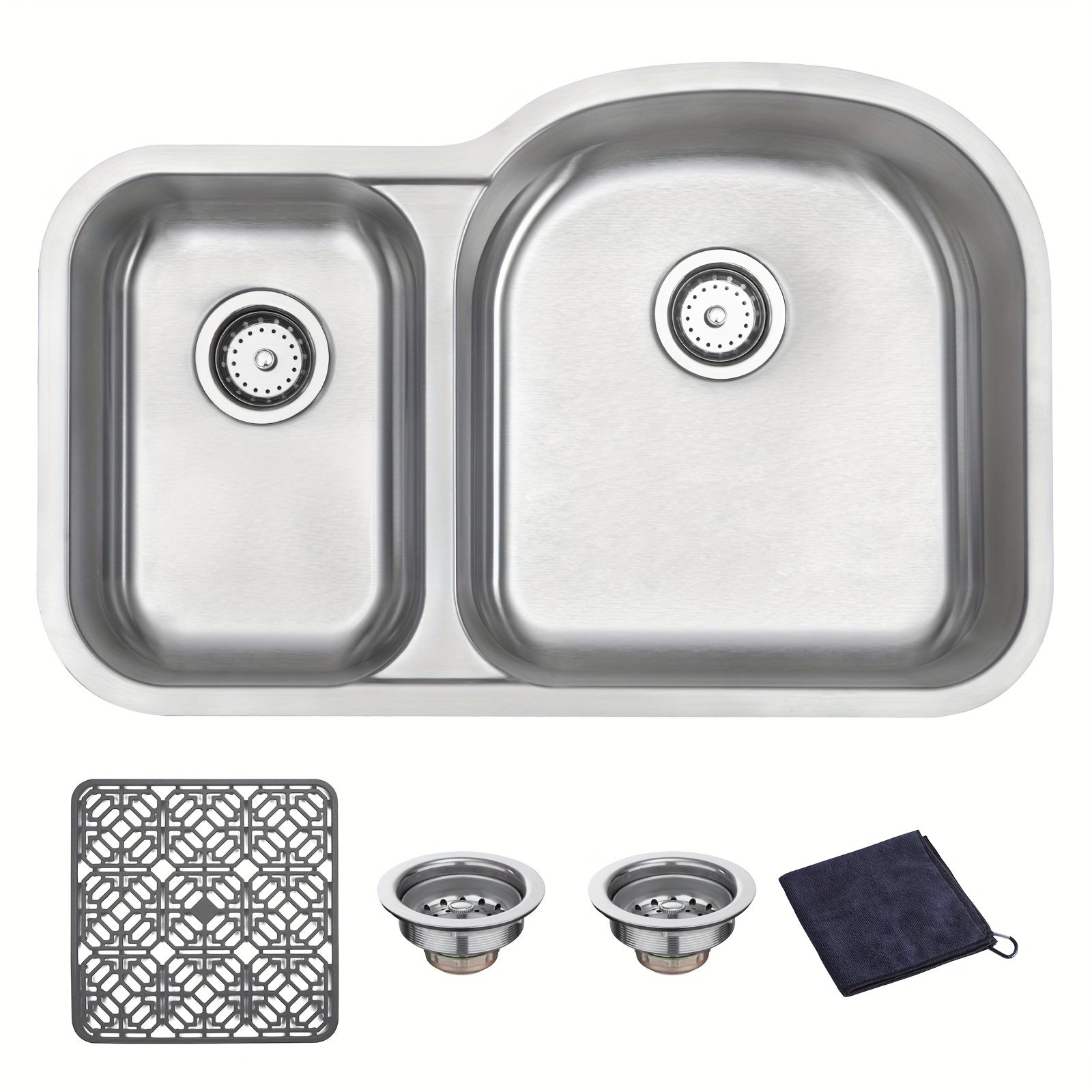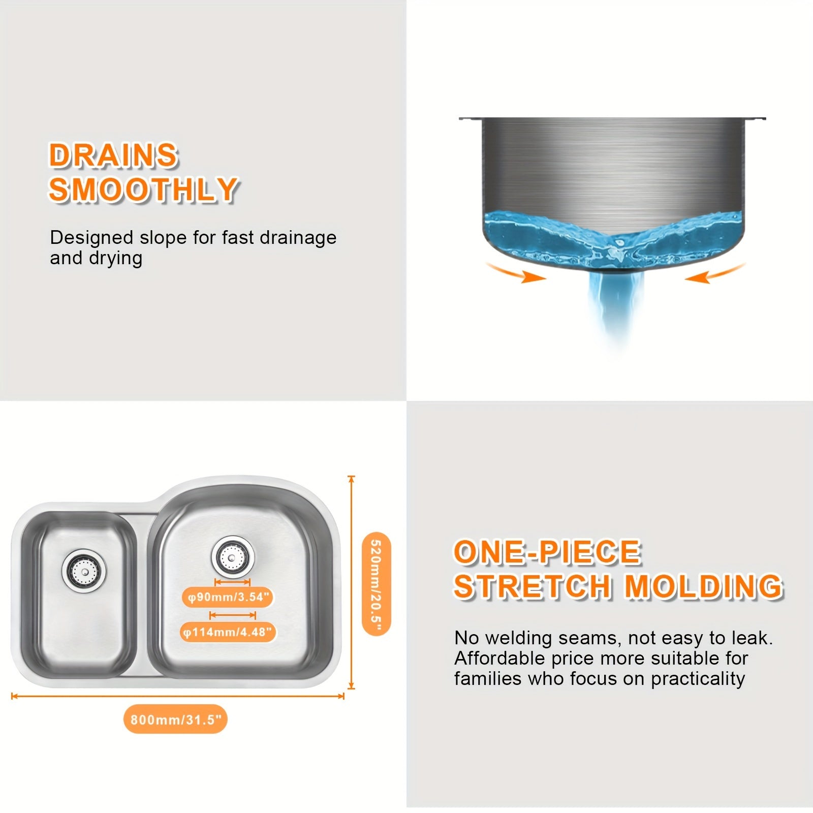 The undermount kitchen sink features a clean and modern design that complements most kitchen appliances. The deep double bowls are made of 18-gauge SUS304 stainless steel, making it heat and rust resistant. The kitchen sink with sloped bottom design facilitates qui flow, preventing standing water in the bottom of the sink