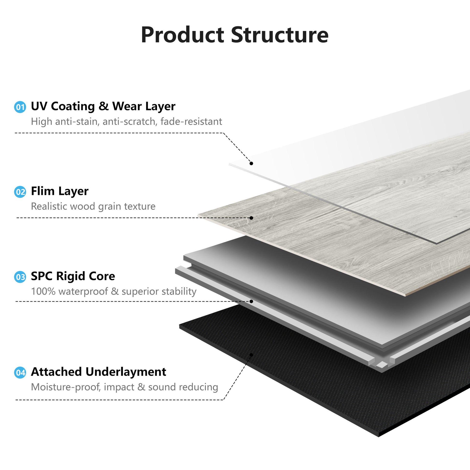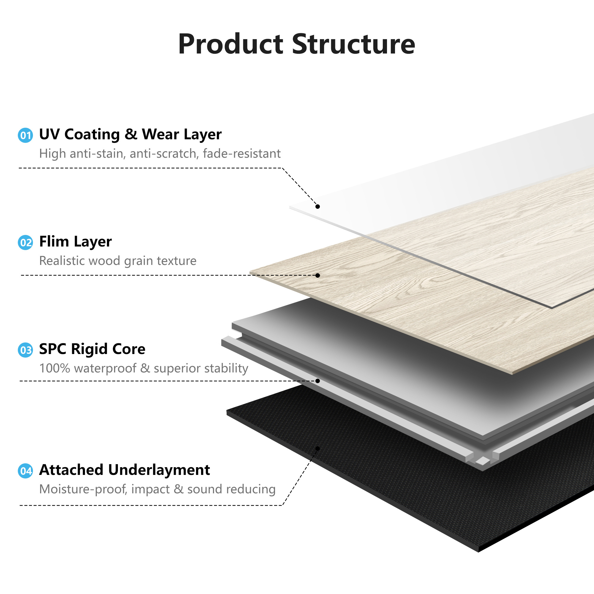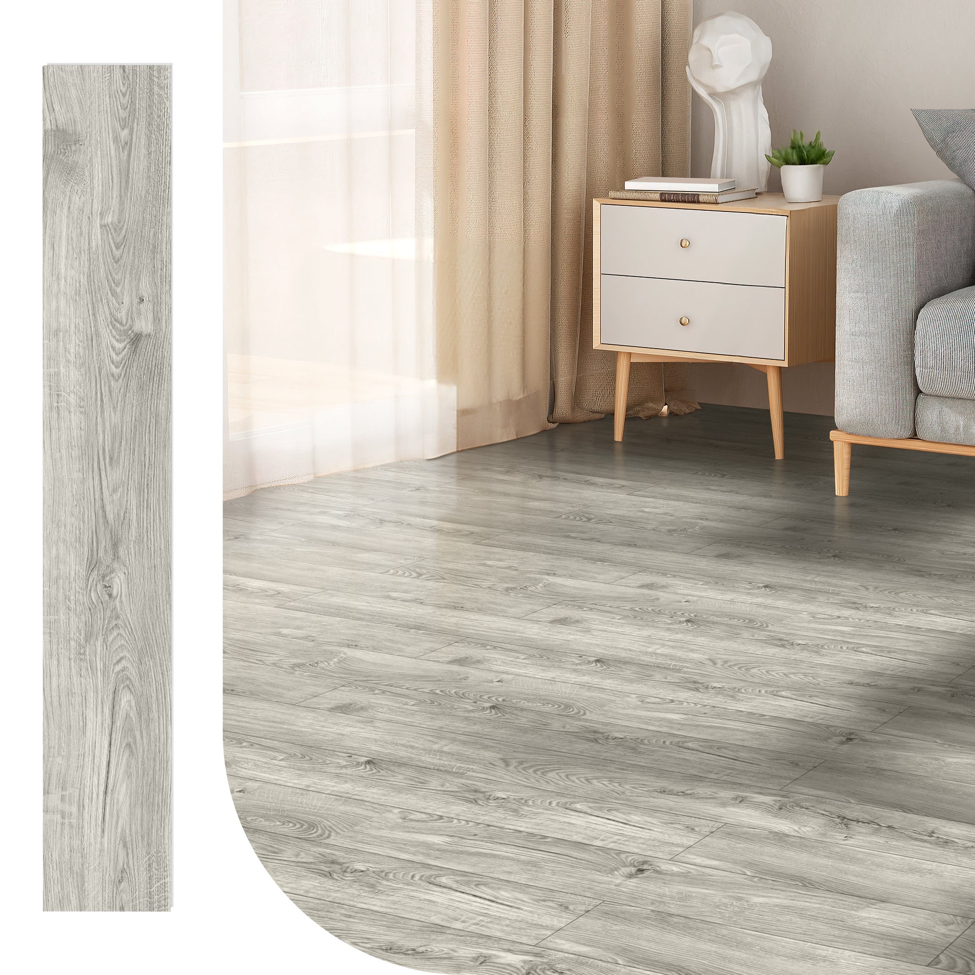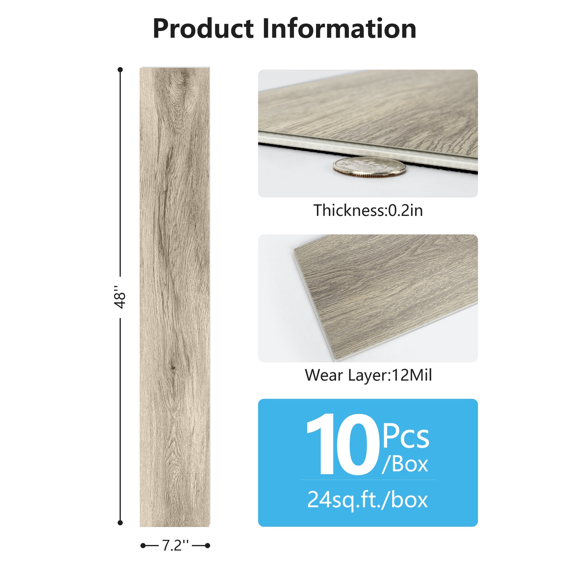 [1] Easy Installation – Features a click-lock system for quick and hassle-free assembly without additional tools. [2] Durable & Waterproof – Made from composite materials designed to resist moisture and daily wear. [3] Convenient Size – Each plank measures 48" x 7.2" x 0.2", providing optimal coverage with minimal seams. [4] 10-Piece Set – Includes 10 planks per box, offering balanced quantity for efficient project planning. [5] Sleek Design – Smooth surface with a modern finish, suitable for various interior styles.