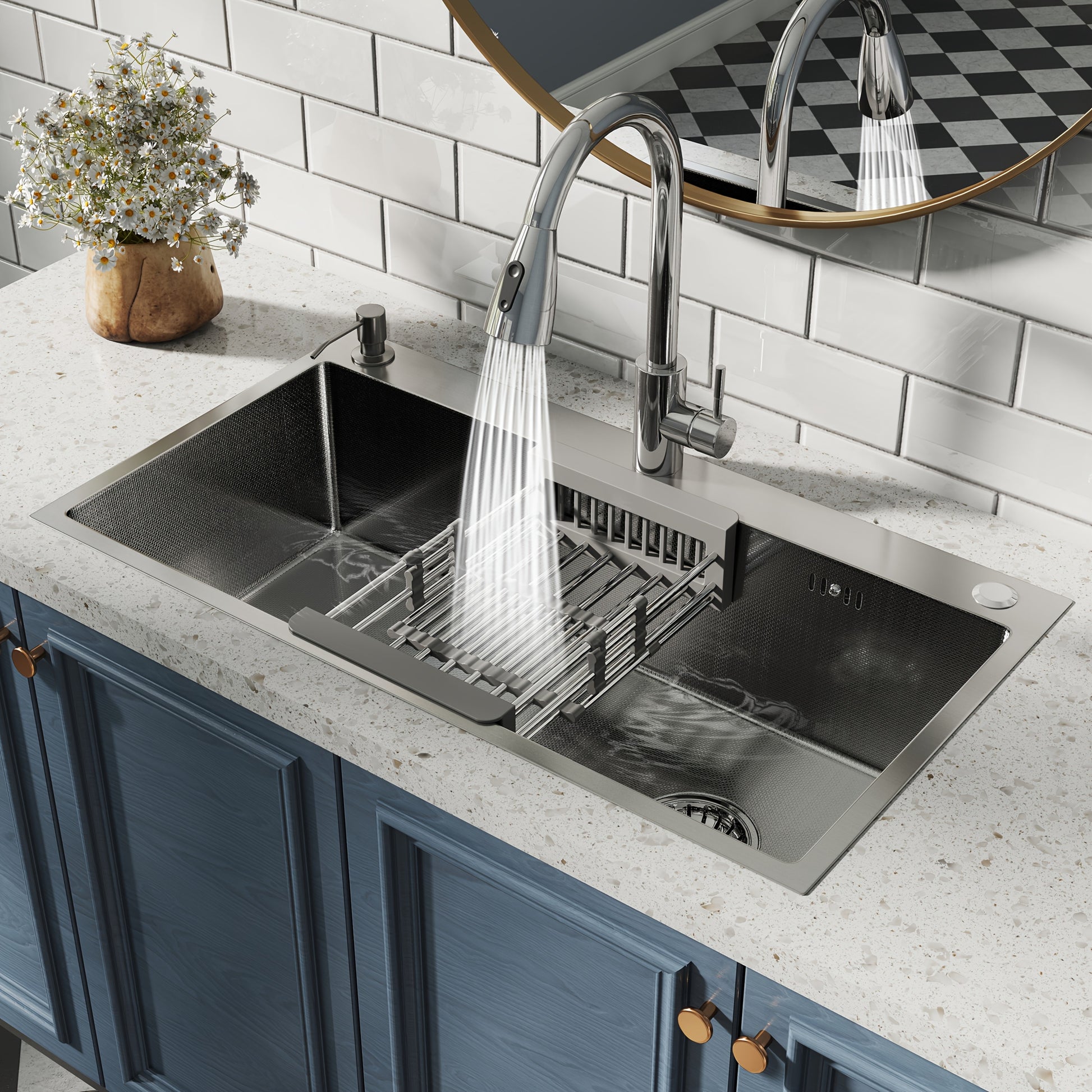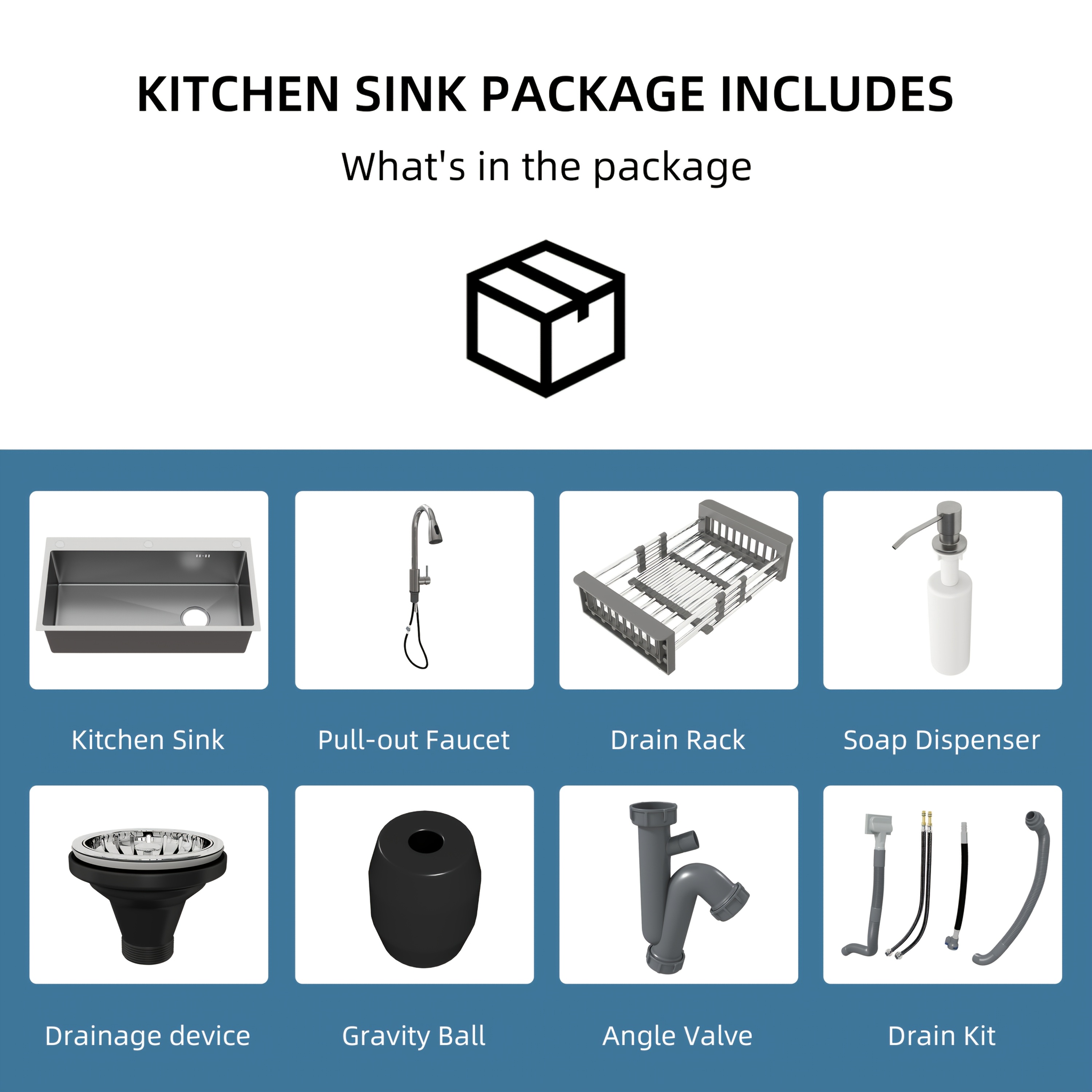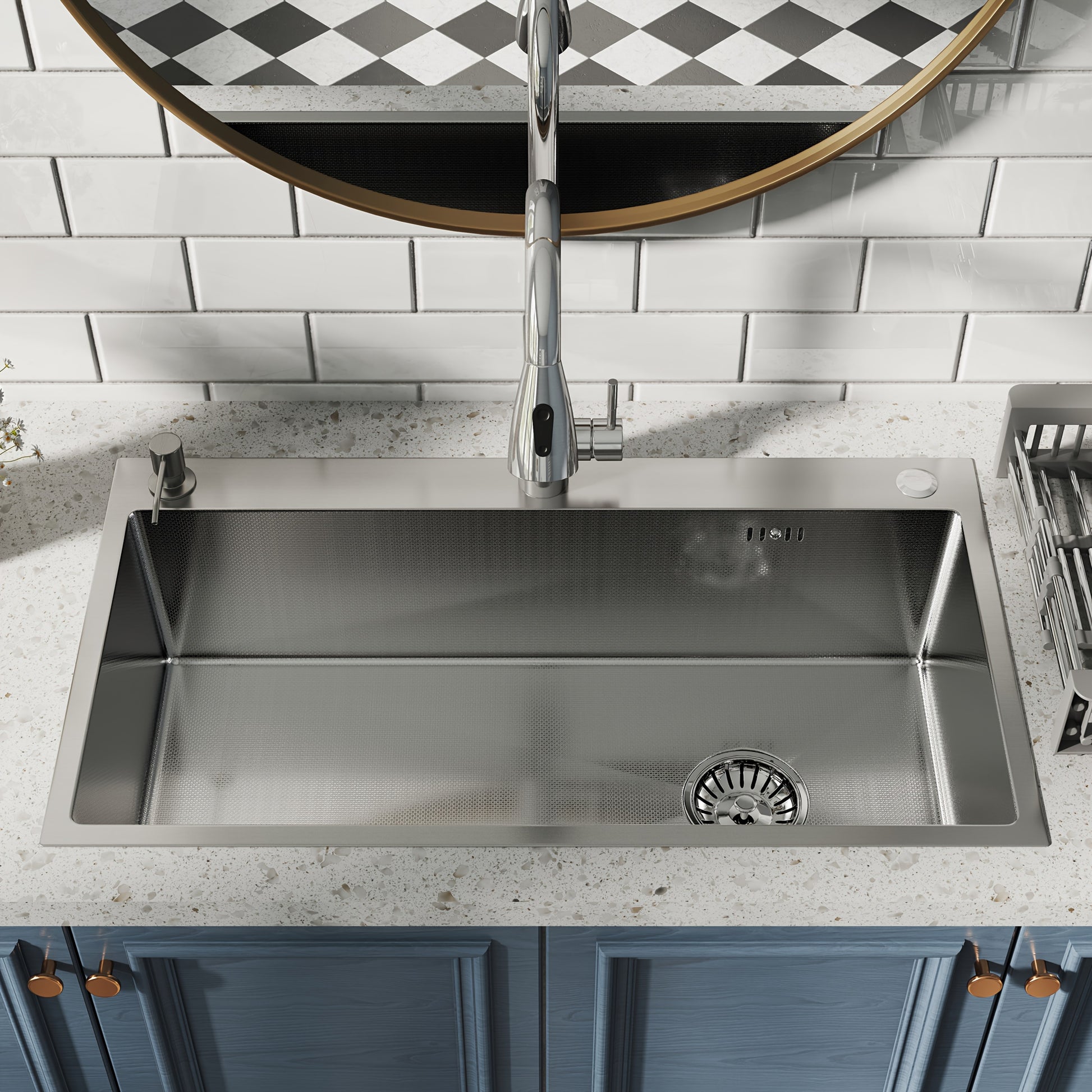 28" 30 "32" Kitchen Sink Stainless Steel Single Bowl Drip Top Installation Imitation Honeycomb Nano-coated Single Bowl Kitchen Sink Stainless Steel Retractable Faucet, Retractable Basket, Soap Liquid Dispenser, Cold And Hot A