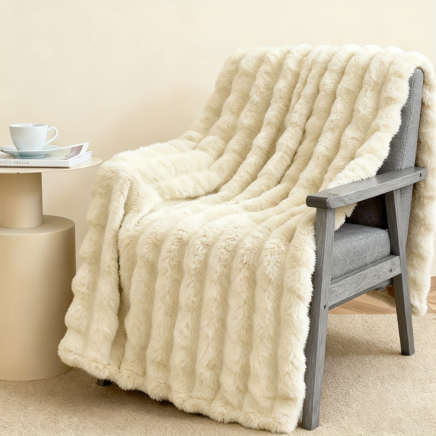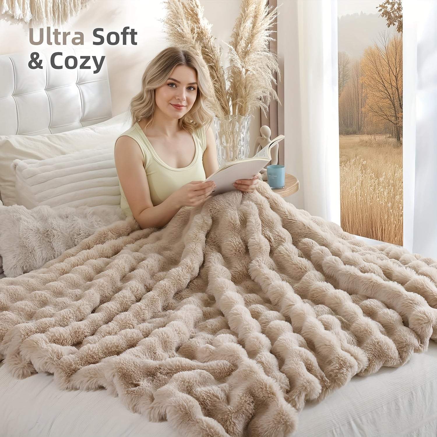 40"x60" Beige Faux Rabbit Fur Blanket - Plush Thick Bubble Texture All-Season Soft Cozy Bedspread, Beige-Tone Beige Furry Couch Cover for Bed, Sofa & - Luxury Bedding Accessory (No Pattern)